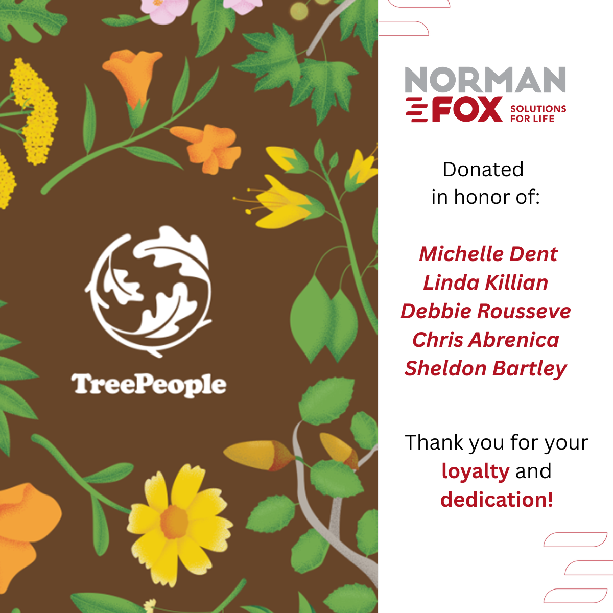 This annual Norfox tradition started in 2023 when we dedicated our trees in honor of our founding members. Last year, we dedicated our trees to supplier partners who have demonstrated great sustainability efforts. And this year, we dedicate our trees in honor of our Norfox Team Members.